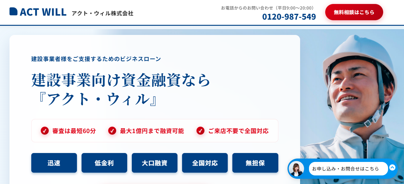 アクト・ウィル株式会社は、建設業に特化したビジネスローンを提供する資金調達サービスです。